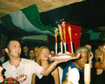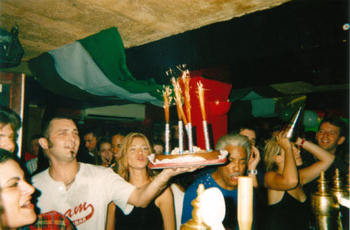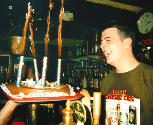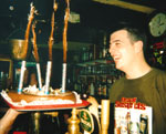 of the 'Shebeen' Bar handing Stev an explosive birthday cake |